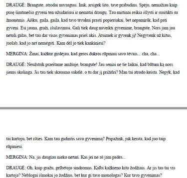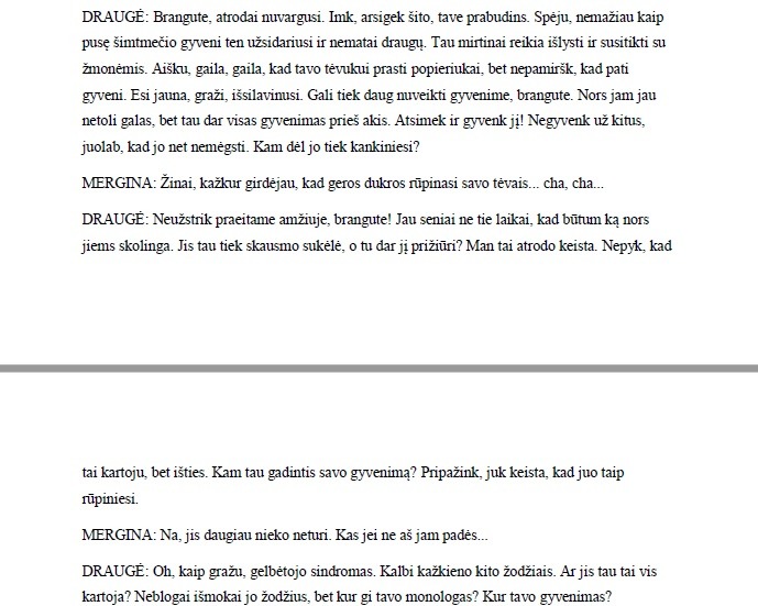 Drama sukurta 2019 metais, po Lietuvos nacionalinio dramos teatro organizuoto "Versmės" konkurso dirbtuvių. Dirbtuvėse su slovėnų dramaturge Simona Semenič išgryninta idėja vėliau baigta savarankiškai (pjesė trijų veiksmų, kiekviename po dvi scenas. Kūrinys 19 psl. apimties, tad drama nedidelio formato). Pateikiama ištrauka. Dėl visos pjesės kreipkitės el. paštu siaurekryptis@gmail.com.